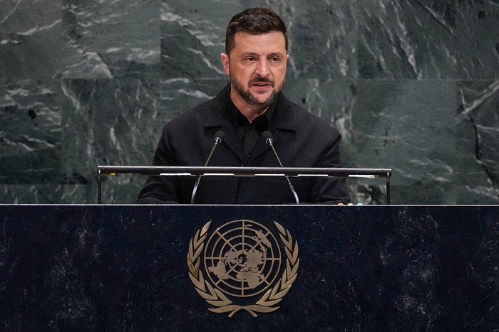 当地时间2025年9月24日,乌克兰总统弗拉基米尔·泽连斯基在纽约联合国大会第80届会议上发表讲话。